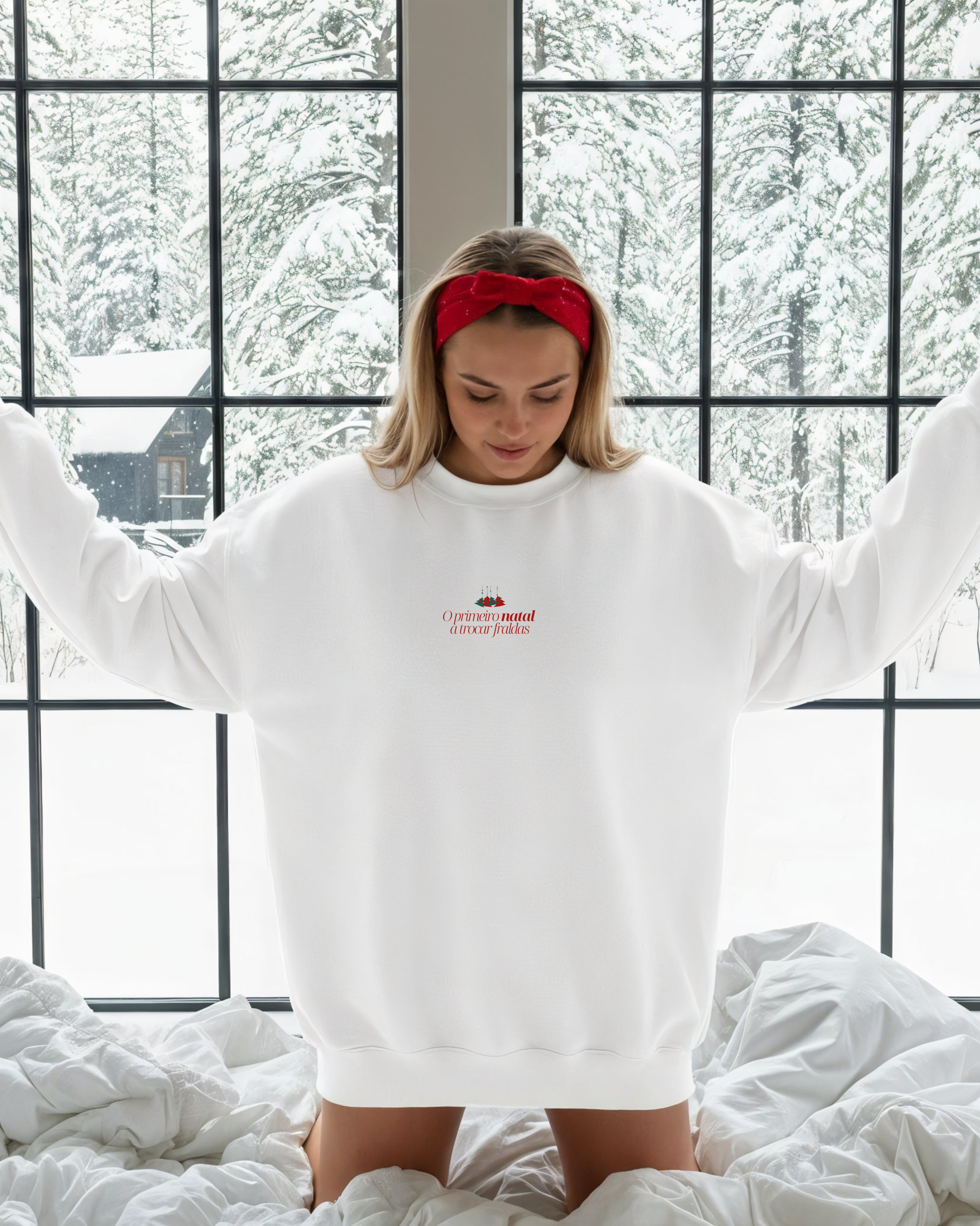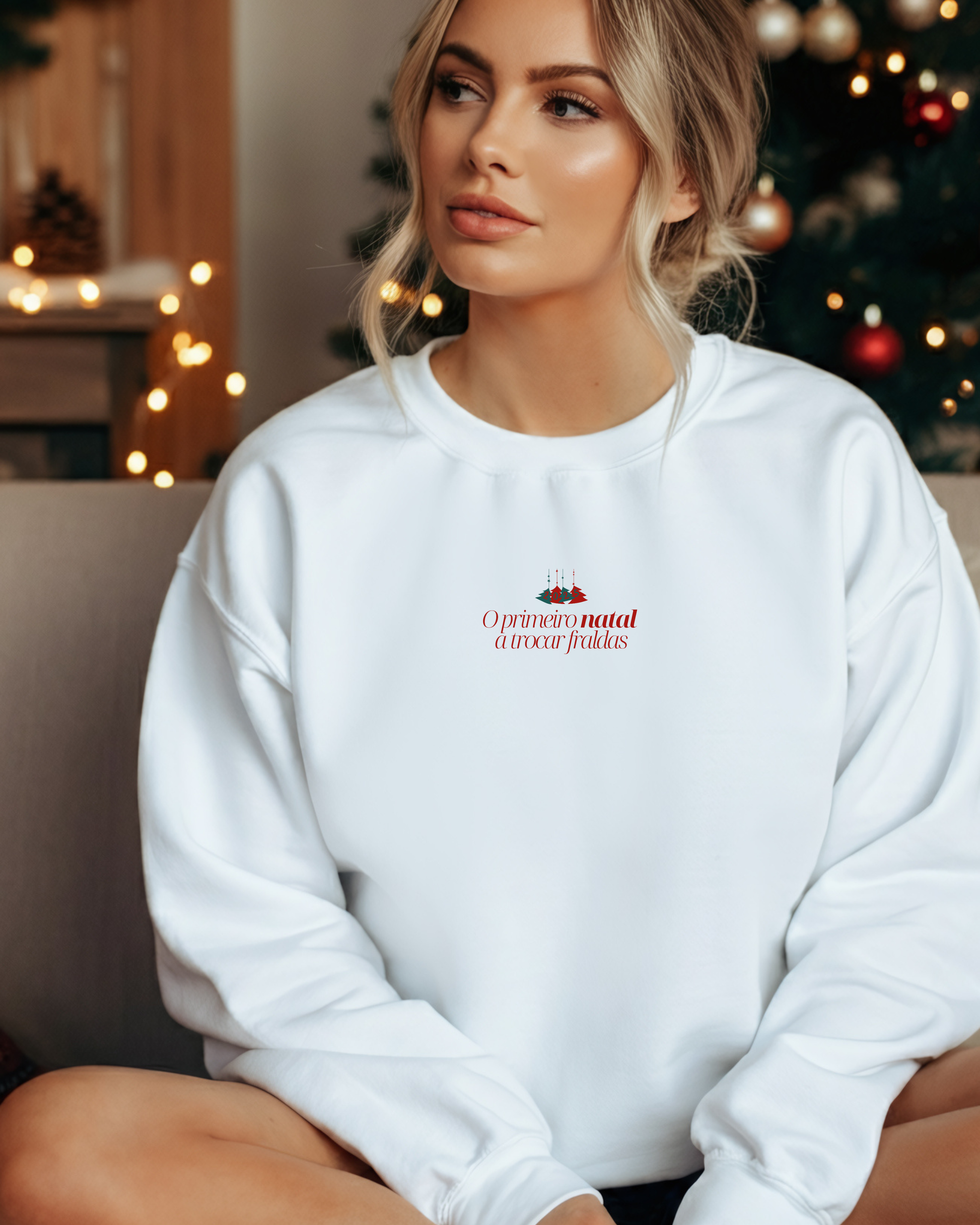 A sweatshirt “O primeiro Natal a trocar fraldas 2025” é o equilíbrio perfeito entre ternura e realidade, com design minimalista e toque natalício elegante.